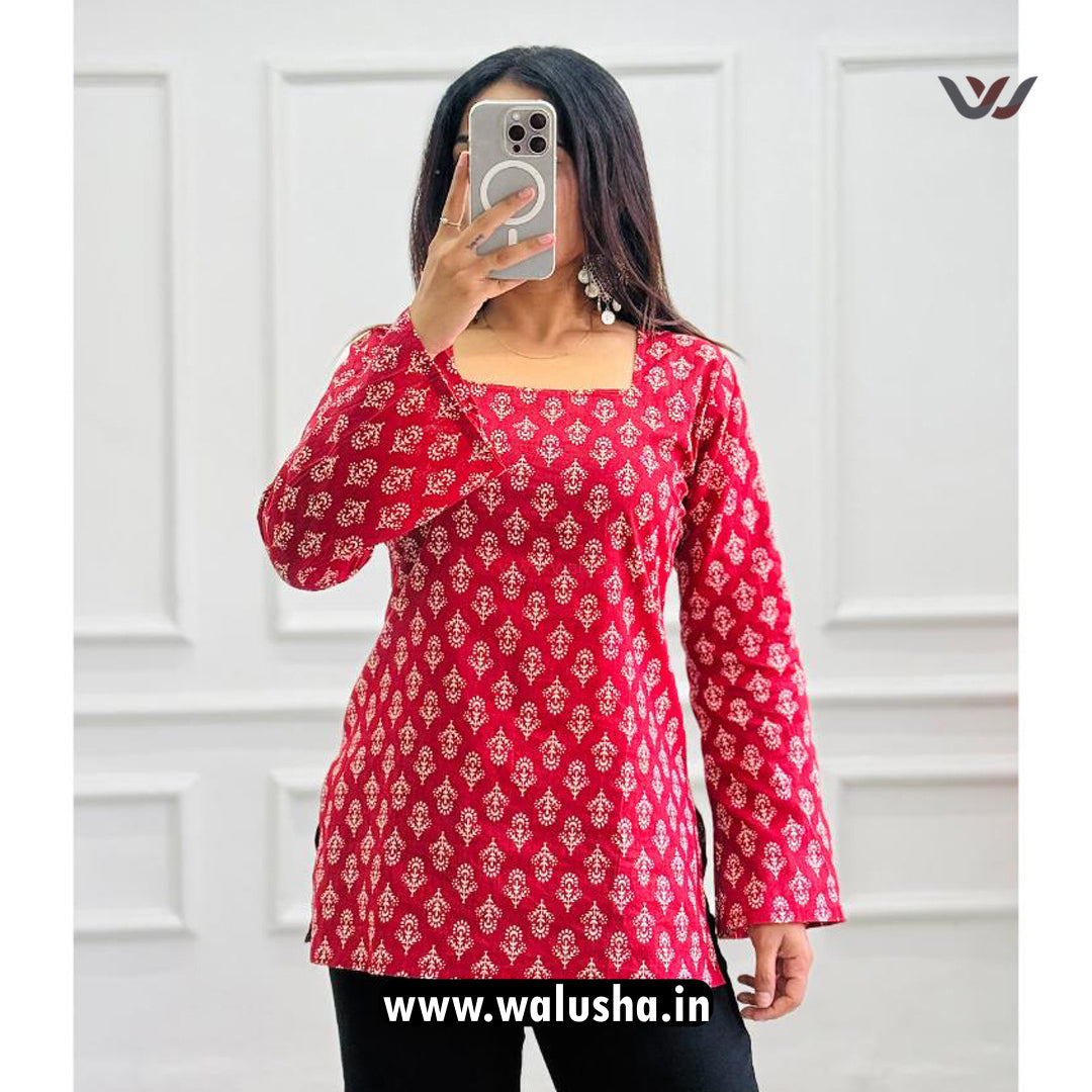 Red Printed Square Neck Bell Sleeve Short Kurti