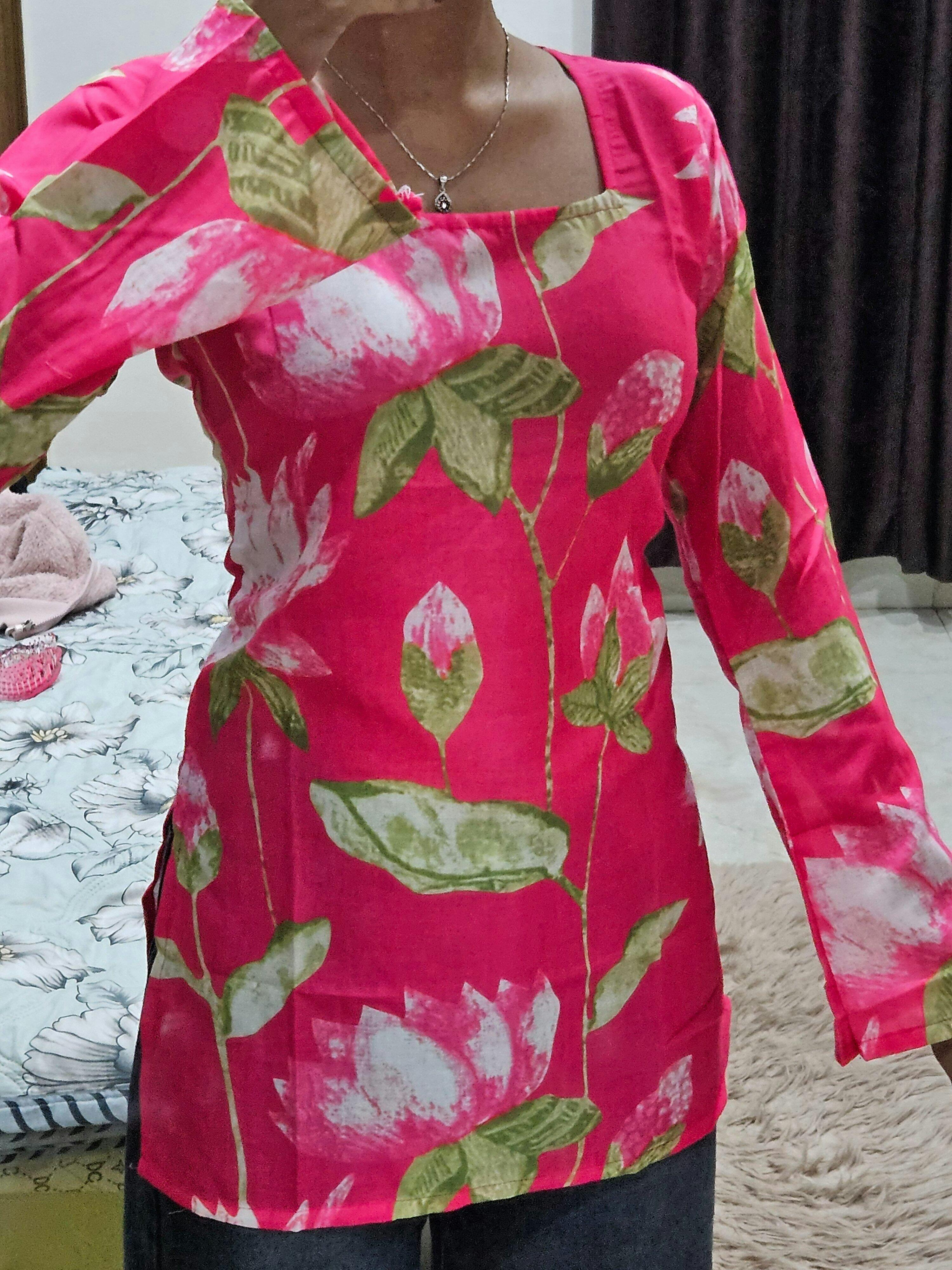 Bright Pink Floral Printed Casual Wear Short Kurti