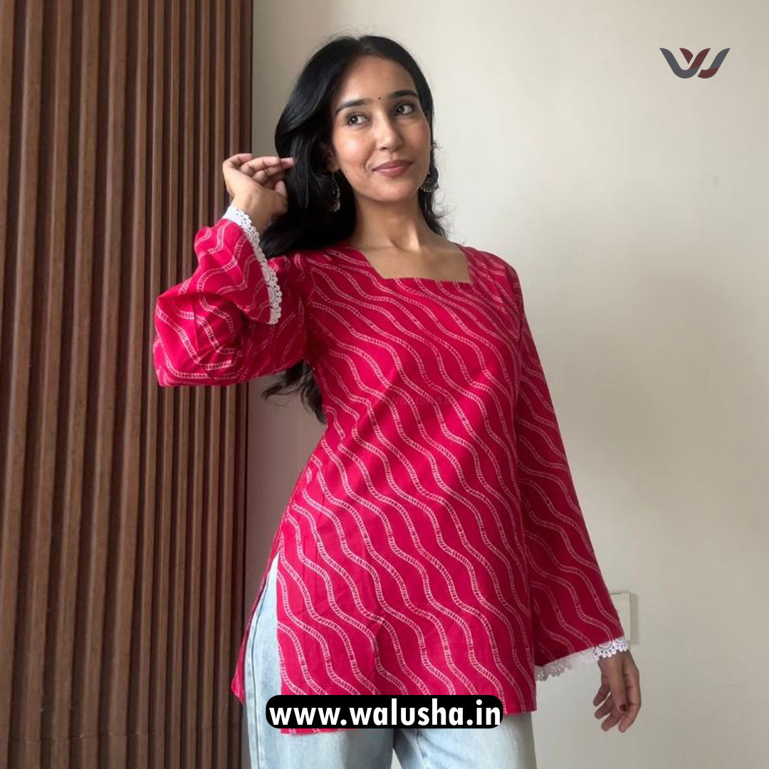 Pink Chic Wave Pattern Bell Sleeve Short Kurti